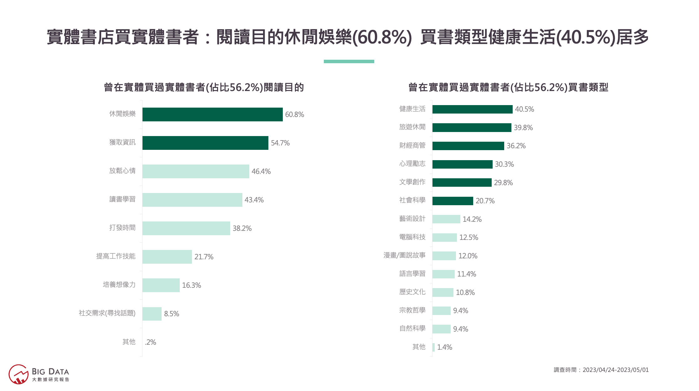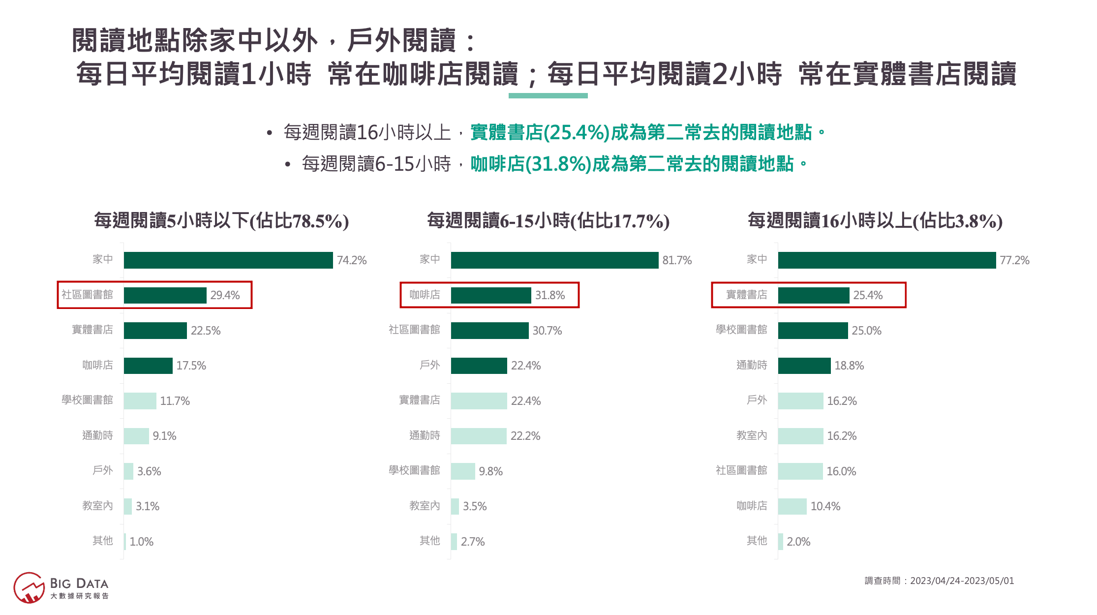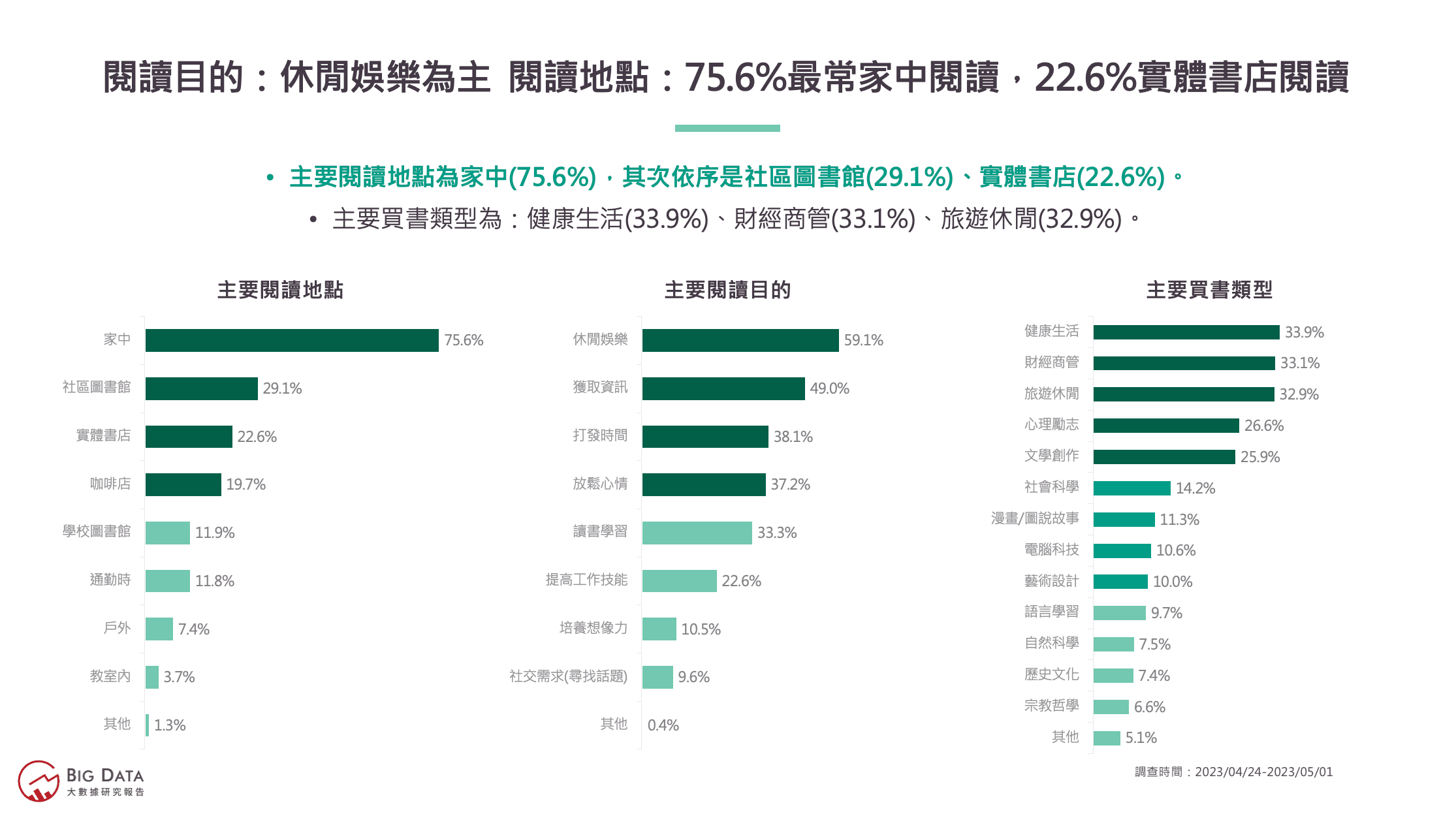 大數據公司透過旗下《網路溫度計民調中心》,以網路調查方法簡單隨機抽樣1,626份有效樣本,在95%信心水準及正負2.44%以內的抽樣誤差下,完成了《2023臺灣民眾閱讀行為暨實體書店》調查。調查數據顯示,隨著科技與網路的發展,生活中需要處理的事情變多,精神壓力變大,時間逐漸碎片化,近8成平均每天閱讀不到1小時,超過2成台灣人每週不看書。有閱讀習慣的受訪者中,多數把閱讀當成一種休閒娛樂,閱讀地點75.6%選擇在家,29.1%在社區圖書館、22.6%則留在實體書店。此外,購買書籍的主要類型分別為健康生活(33.9%)、財經商管(33.1%)及旅遊休閒(32.9%),若閱讀時數短偏向健康生活主題,閱讀時數長以文學創作風格為主。