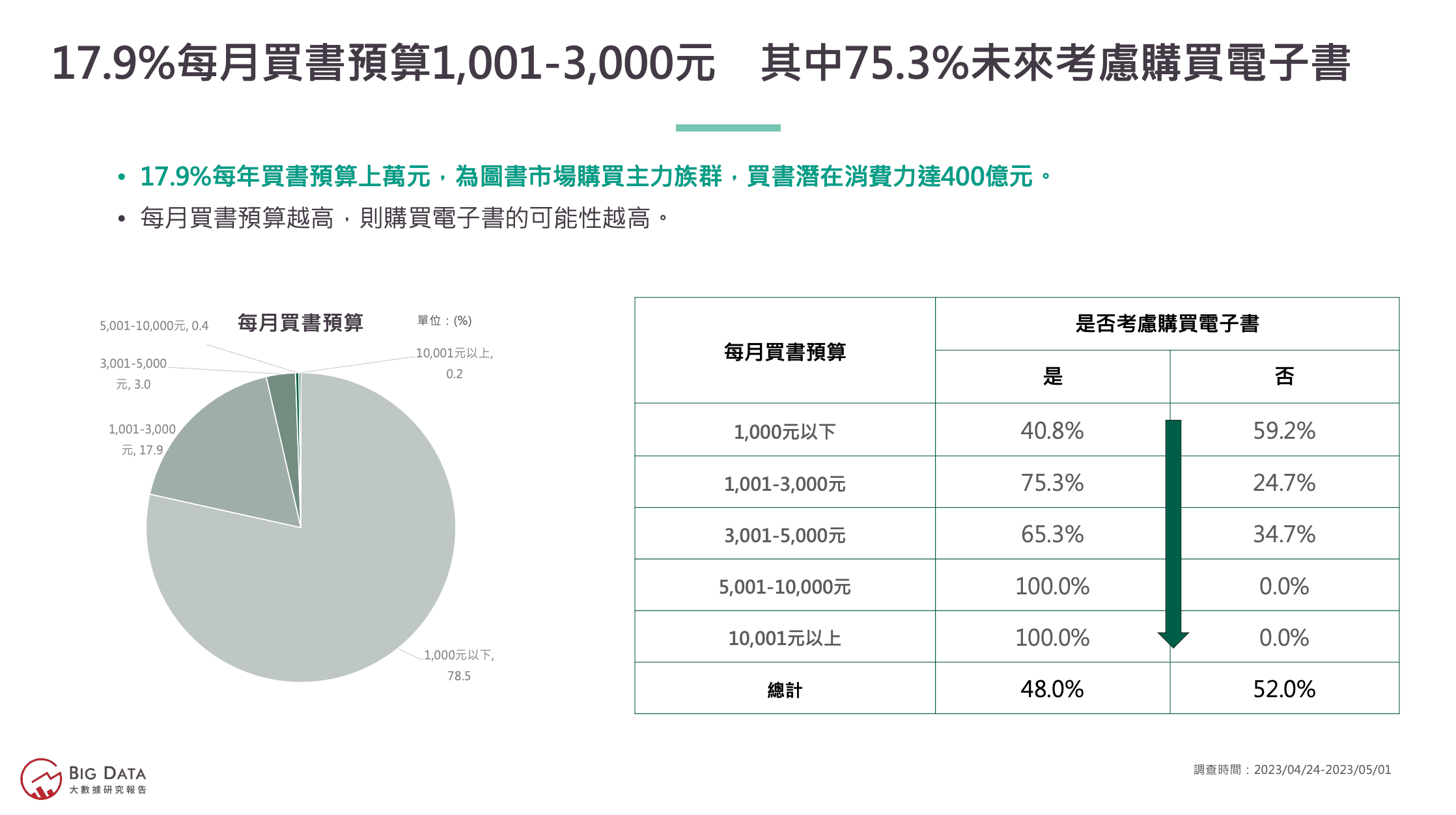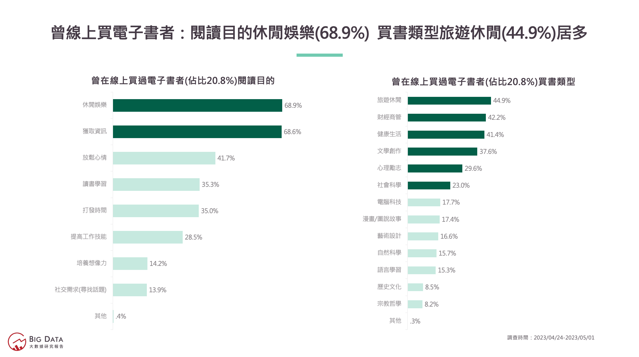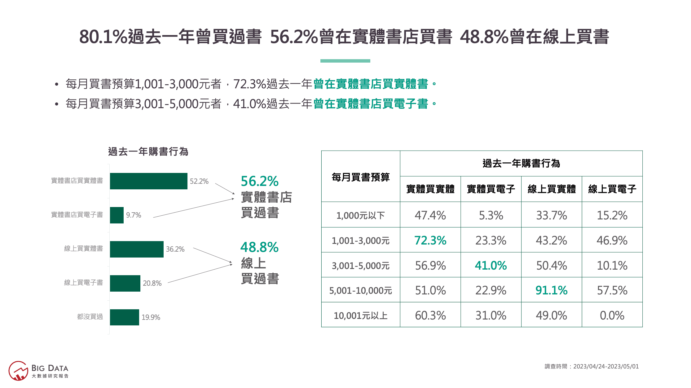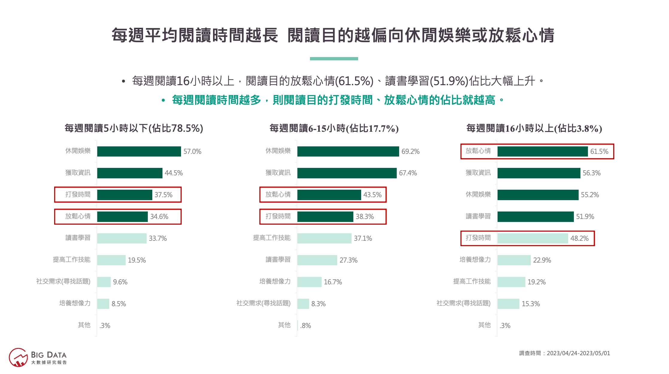 大數據公司透過旗下《網路溫度計民調中心》,以網路調查方法簡單隨機抽樣1,626份有效樣本,在95%信心水準及正負2.44%以內的抽樣誤差下,完成了《2023臺灣民眾閱讀行為暨實體書店》調查。調查數據顯示,隨著科技與網路的發展,生活中需要處理的事情變多,精神壓力變大,時間逐漸碎片化,近8成平均每天閱讀不到1小時,超過2成台灣人每週不看書。有閱讀習慣的受訪者中,多數把閱讀當成一種休閒娛樂,閱讀地點75.6%選擇在家,29.1%在社區圖書館、22.6%則留在實體書店。此外,購買書籍的主要類型分別為健康生活(33.9%)、財經商管(33.1%)及旅遊休閒(32.9%),若閱讀時數短偏向健康生活主題,閱讀時數長以文學創作風格為主。