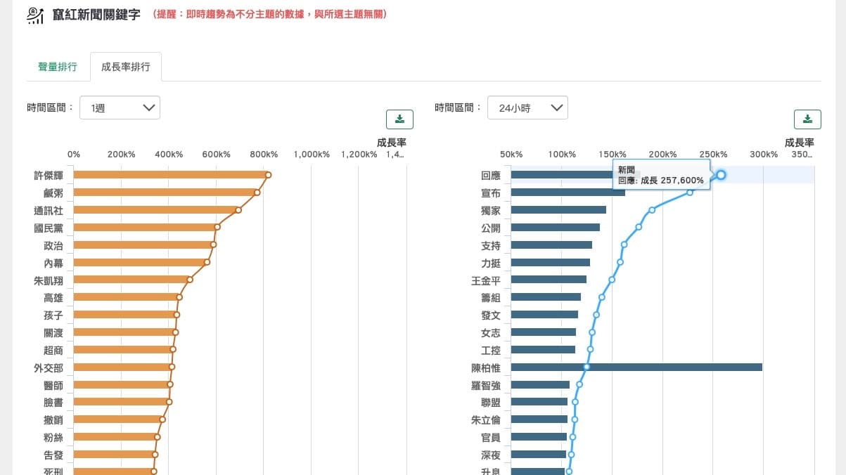 《KEYPO大數據關鍵引擎》長久以來使用者皆能透過自行設定主題,從網路聲量、數據資料、輿情分析及多元化視覺互動報表中,獲得完整的網路數據輪廓,團隊也持續不斷為產品推陳出新,提供更快速、準確地服務內容。「多維度分析雷達圖」是使用者期待新增的項目,使用多維度分析時,可將趨勢圖切換為雷達圖,繪製主題間的聲量面積,並呈現不同面向的聲量筆數,方便做數據對比。另外,竄紅新聞關鍵字新增「成長率排行」,使用者在觀察竄紅新聞關鍵字時,除原有的聲量筆數排行外,可切換至以折線圖顯示的「成長率排行」,透過比對關鍵字在不同時間區間的成長筆數及成長率,能更清楚掌握即時關鍵字的竄升力道。