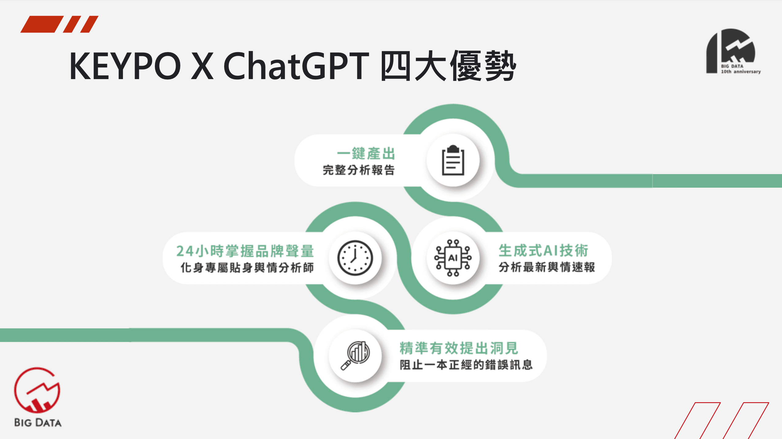 AI人工智慧已被討論多年,但直到今年初人工智慧聊天機器人程式ChatGPT一出現,驚豔眾人,不只ChatGPT用戶數持續激增,應用範圍也越來越廣,尤其在社群媒體管理。不論從內容創建到客戶服務等各方面,ChatGPT在理解和回應自然的語言能力,皆能提高品牌在社群媒體存在感。大數據公司在旗下輿情分析系統《KEYPO大數據關鍵引擎》推出全台首創「ChatGPT智能輿情分析」功能,就是一套透過ChatGPT進行情感分析和社群媒體監測的創新解決方案,只需要按下一鍵,即可產出最新輿情分析速報,讓原本需要數小時或數天的分析洞察過程縮短至數分鐘。因為結合擁有每月處理上千億中文數據,超過30億筆大數據輿情資料庫的《KEYPO大數據關鍵引擎》,能精準有效提出洞見,阻止提供用戶一本正經的錯誤訊息。大數據公司技術長孟令三說明,除了速度快與語意精確,系統智慧自動判斷聲量高點,結合ChatGPT自然語言解析能力,能為企業品牌帶來更明顯且客觀的解析,進而強化消費者體驗、改善品牌聲譽並做出明智的決策,24小時掌握品牌聲量,化身專屬貼身輿情分析師,保持優勢地位。