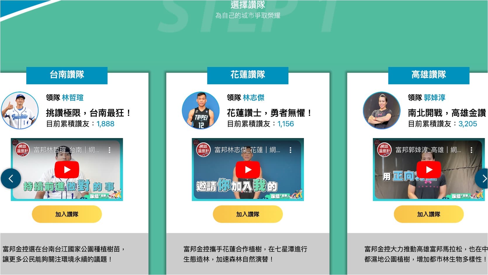 全台最大數據內容媒體平台「網路溫度計」即日起至8月31日止,攜手富邦金控推出「永續讚市 THUMBS UP 4 GREEN」線上活動,本屆永續讚市的代表分別為台北、新北、桃園、台中、彰化、台南、高雄及花蓮,皆透過網路大數據評選出。富邦金控更邀請舉重女神郭婞淳、臺北富邦勇士林志傑、蔡文誠、周桂羽及洪楷傑、富邦悍將林哲瑄及曾峻岳、Fubon Angels啦啦隊慈妹為自己的城市擔任領隊,像是臺北富邦勇士林志傑出生於花蓮,富邦悍將林哲瑄從小學到高中都在台南就讀,Fubon Angels的慈妹則是道道地地的桃園人,讓領隊們與所屬城市有著更深的在地連結,號召更多粉絲加入應援。民眾只要每天登錄參加「跑跑讚市」遊戲,為自己支持的城市努力起跑,遊戲互動不限參加次數,每次10秒的跑步遊戲歷程中,單次超過100km就會出現驚喜寶物,並額外取得里程獎勵,累積的里程將歸到所選擇的隊伍裡,累積公里數最高的城市,將可獲得「Run For Green™獎」。