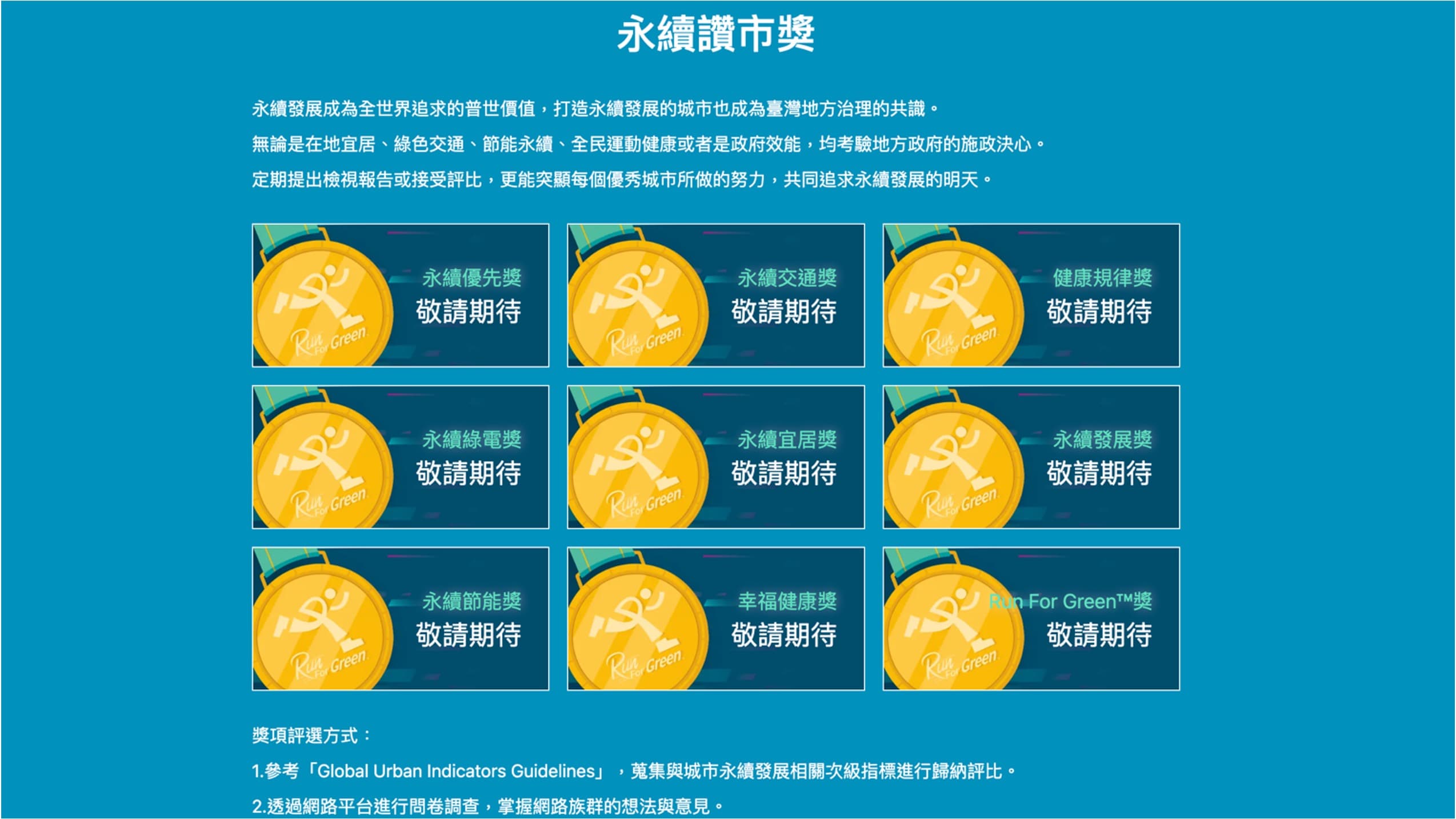 永續發展成為全世界追求的普世價值,打造永續發展的城市也成為臺灣地方治理的共識。網路溫度計與富邦金控透過網路大數據評選出台北、新北、桃園、台中、彰化、台南、高雄及花蓮等8大台灣永續代表縣市,參考「Global Urban Indicators Guidelines」蒐集與城市永續發展相關次級指標,並透過透過網路平台進行問卷調查,掌握網路族群想法與意見進行歸納評比,預計於9月針對在地宜居、綠色交通、節能永續、全民運動健康或者是政府效能等頒發「永續優先獎」、「永續交通獎」、「慢活馬拉松獎」、「永續綠電獎」、「永續宜居獎」、「永續發展獎」、「永續節能獎」、「縣民健康獎」及「永續效能獎」等9項永續讚市獎。透過大數據的洞察分析觀點能突顯每個優秀城市對永續政策所做的努力,並攜手富邦金控推廣拯救氣候的理念,希望民眾一起在日常生活中實踐減碳永續。