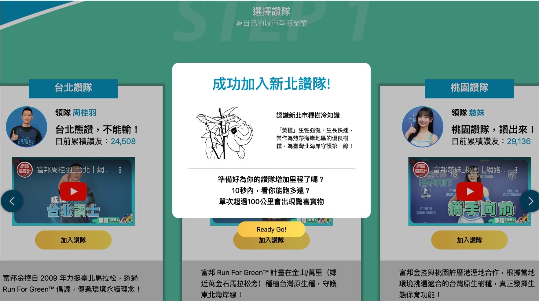 富邦金控自2021年起推動「Run For Green™」ESG倡議計畫,從金融與非金融兩大層面發揮企業影響力,推動綠色轉型,以達淨零的永續目標。富邦金控是唯一贊助臺北馬、田中馬、萬金石、高雄馬等四大馬拉松的企業,並積極持續推動「綠色賽事」,更將影響力進一步擴大到賽道之外,發展出「Run For Green™」在各縣市植樹計劃。民眾也可於「永續讚市 THUMBS UP 4 GREEN」活動網站上了解富邦金控在各城市所栽種的樹種特色,及與周邊生態間的關係,如:在台中南埔溪出海口是富邦金控與臺灣山林復育協會合作森林復育下栽種的「穗花棋盤腳」,「穗花棋盤腳」在夏日花開季節,越夜越美麗,但天一亮就凋落,因此有「夏夜煙火」的美名;或是因「黃槿」生性強健、生長快速,常作為熱帶海岸地區的優良樹種,即是富邦金控在金山萬西段(鄰近萬金石馬拉松旁)種植守護東北海岸線的台灣原生種,這些資訊都能讓民眾從遊戲互動中認識臺灣土地多樣生態。