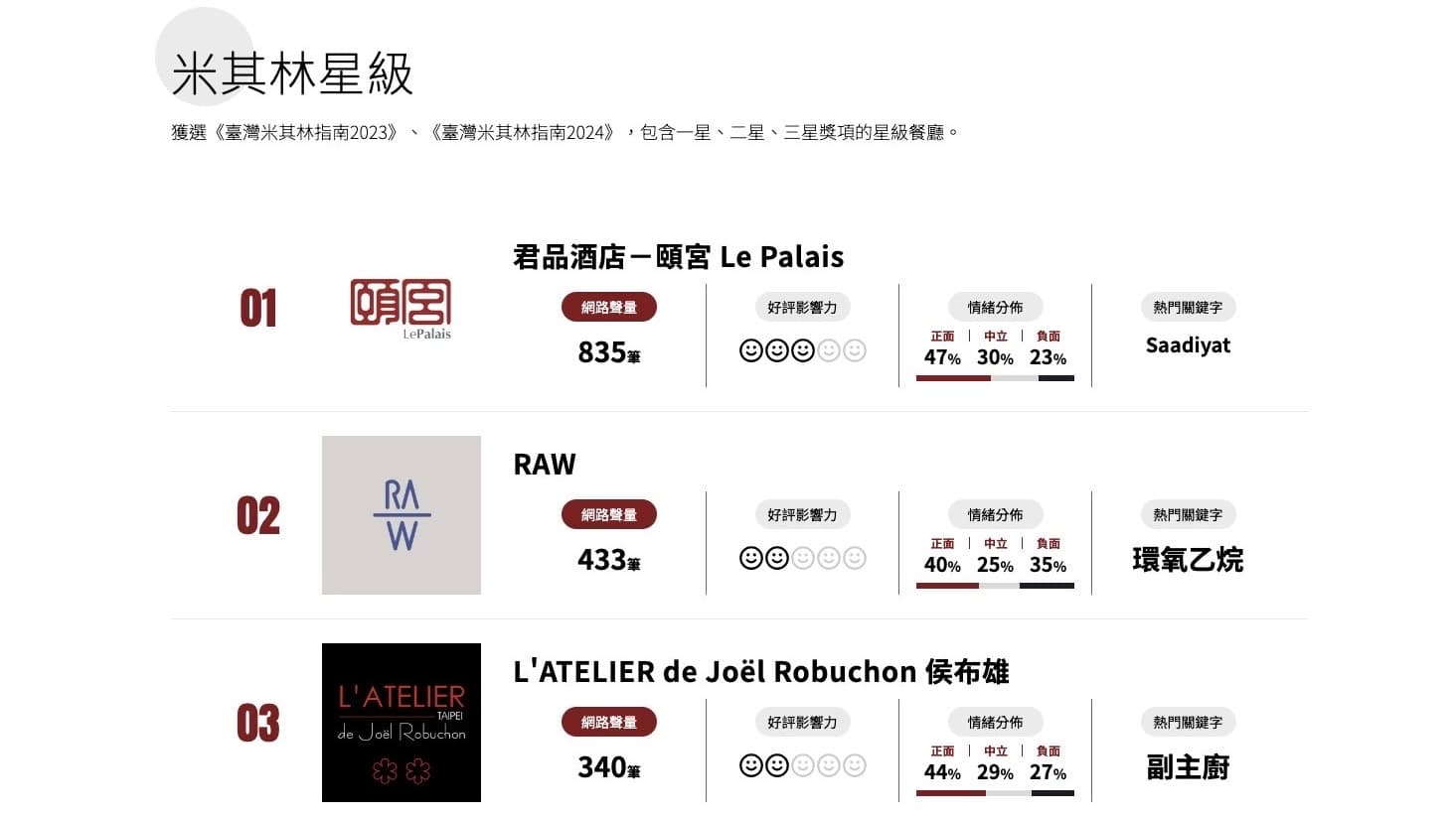 《網路溫度計DailyView》盤點2023年、2024年《台灣米其林指南》共計50家摘星餐廳,透過網路聲量、好評影響力、熱門關鍵字、情緒分布等數值看見「米其林星級」榜上每一家餐廳的網路熱度。除了網路聲量之外,口碑聲量排行榜中還包含其他參考數值,像是正負情緒分布,以及根據網路聲量和好感度加權計算、能夠反映出「好評」與「聲量影響力」的「好評影響力」數據。「米其林星級」榜上前幾名多為較有話題性的餐廳,君品酒店頤宮接連7年都拿下米其林三星殊榮,在這次的摘星名單中備受矚目,也成為目前月榜冠軍;第二名的RAW就因為今年底即將停業而帶出許多討論及新聞報導;第3名的L'ATELIER de Joël Robuchon 侯布雄則以2024台北侯布雄法式餐廳年度盛會「Robuchon Week星光週」,引發不少話題。