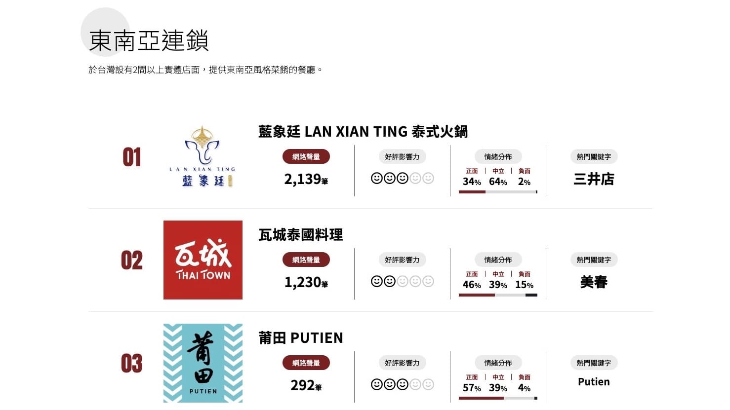 每日更新的「東南亞連鎖」口碑聲量排行榜聚焦於台灣設有2間以上實體店面,提供東南亞風格菜餚的餐廳。截至11月1日止,最新月榜前三名中,冠、亞軍分別以泰式料理聞名的「藍象廷 LAN XIAN TING 泰式火鍋」及「瓦城泰國料理」,季軍則由新加坡米其林一星餐廳「莆田PUTIEN」拿下。