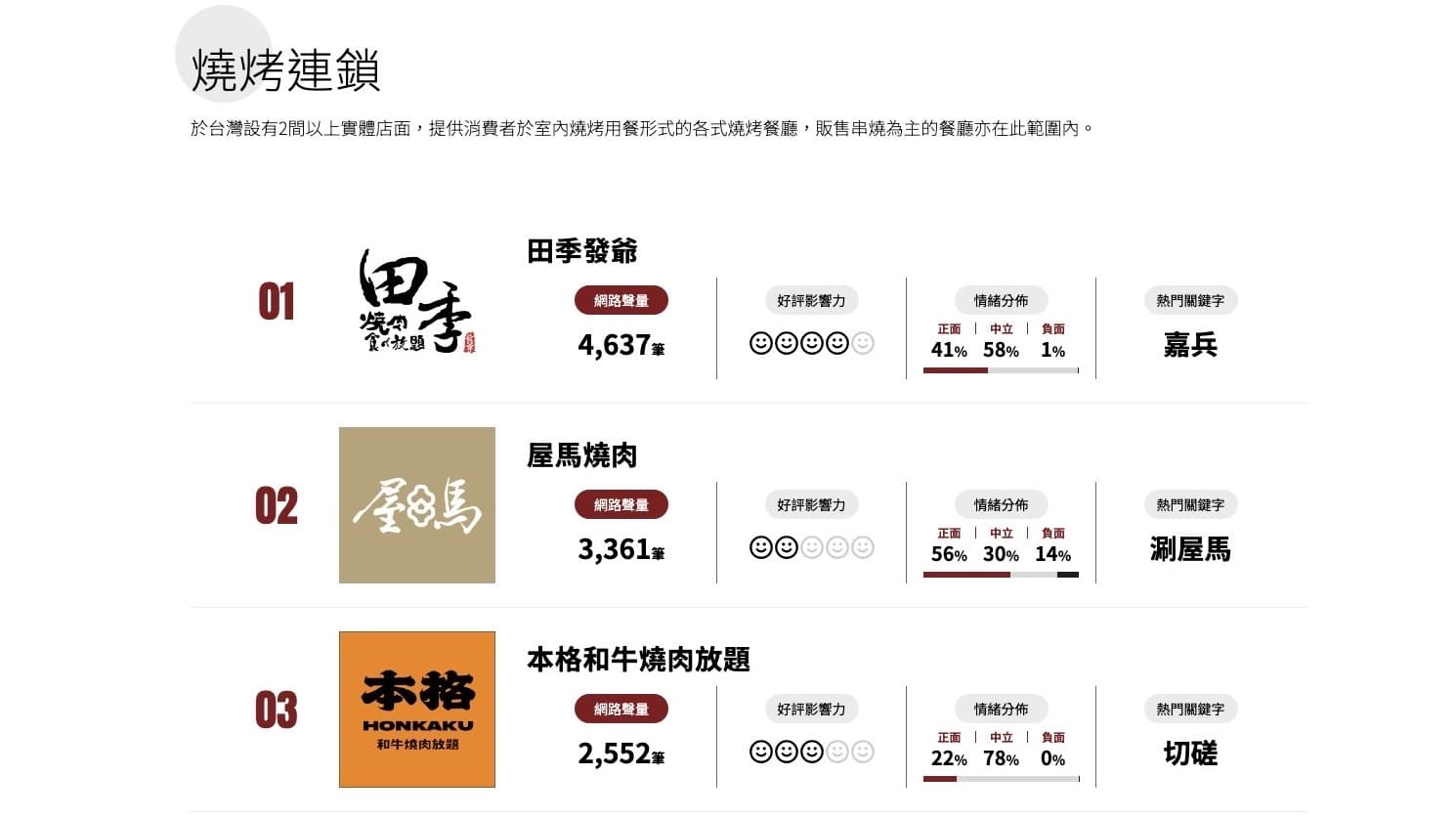 「燒烤連鎖」口碑聲量排行榜也重新調整分析範圍,以台灣設有2間以上實體店面,提供消費者於室內燒烤用餐形式的各式燒烤餐廳,包含販售串燒為主的餐廳,皆作為榜單標準。月榜榜首是以主打火烤兩吃的「田季發爺」,近期慶祝18週年,除了更新夢幻海陸大餐菜單,也推出「小小兵」限量聯名周邊,引起網路熱烈討論。第二名則是被稱為全台最強燒肉店的「屋馬燒肉」,用餐時段總是排著滿滿的人潮,至少要提前一個月才能訂到位;第三名是築間集團旗下的燒肉品牌「本格」,主打和牛吃到飽,和牛油花分布均勻,肉汁鮮甜又入口即化。