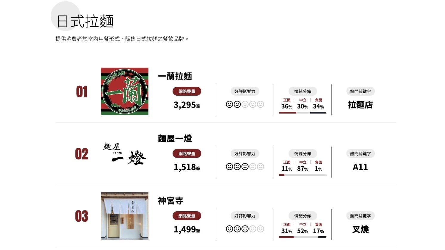 口碑聲量排行榜「日式拉麵」主題將針對提供室內用餐形式並販售日式拉麵的餐廳進行分析與排名,總計175家。目前月榜第一是進軍台灣已有7年的日本知名連鎖拉麵品牌「一蘭拉麵」,近期,日本一蘭拉麵推出秘傳辣醬「一蘭旨辛コク増し」,據說秘方僅有公司內部4人知曉,在社群上引發熱烈討論。不過,不少網友認為台灣的辣椒醬更勝一籌。第二名則為東京拉麵之王美名的「麵屋一燈」,進軍台灣八年再度跨足信義區開設二店,除了湯頭升級也推出新品和信義店限定口味拉麵;第三名是來自日本名古屋的拉麵品牌「二層泡鷄白湯 神宮寺」,日前於高雄漢神巨蛋購物廣場4樓開設其海外直營首店。