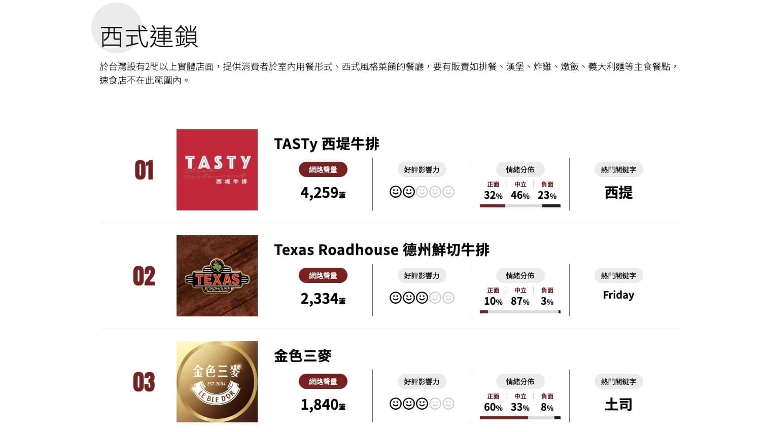 「西式連鎖」口碑聲量排行榜收錄全台設有2間分店以上,販售西式風格菜餚如排餐、漢堡、炸雞、燉飯等主食的餐廳(除速食餐廳)。最新月榜冠軍為王品集團旗下「TASTy 西堤牛排」,透過捐血享5折、兩人同行內用2客經典套餐及萬聖節變裝送BBQ炸雞等消費者活動,提升媒體報導及社群討論度。亞軍則是登台10周年的美國連鎖品牌「Texas Roadhouse德州鮮切牛排」,以祭出周年慶活動及攜手彩妝品牌與通路推出最美壽星組合餐,帶動話題討論;季軍是知名餐酒集團「金色三麥」,日前攜手超商業者針對雙方生產鏈中土司邊、麥芽粕等剩食餘料,聯名開發出永續啤酒與二款烘焙新品。