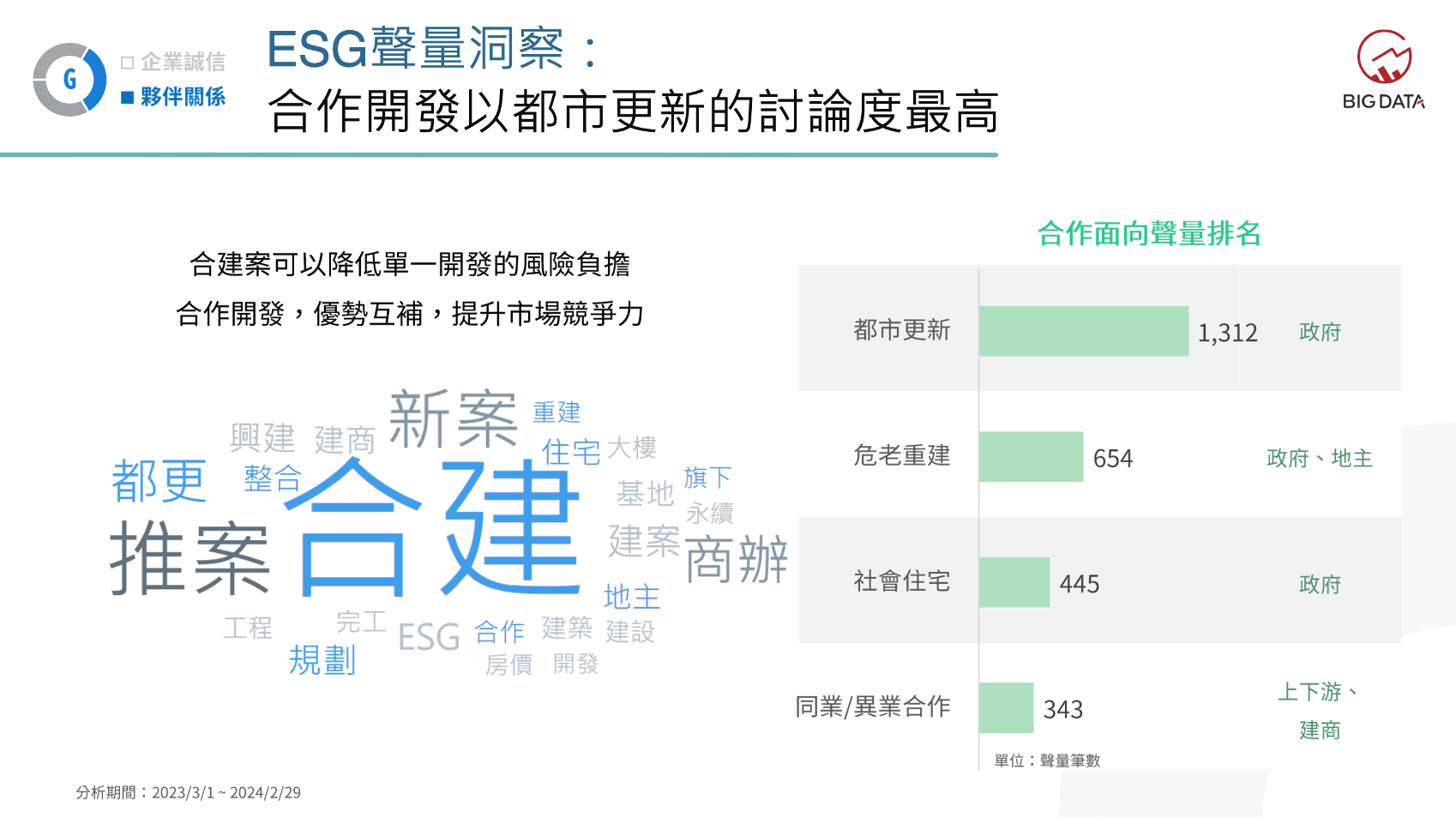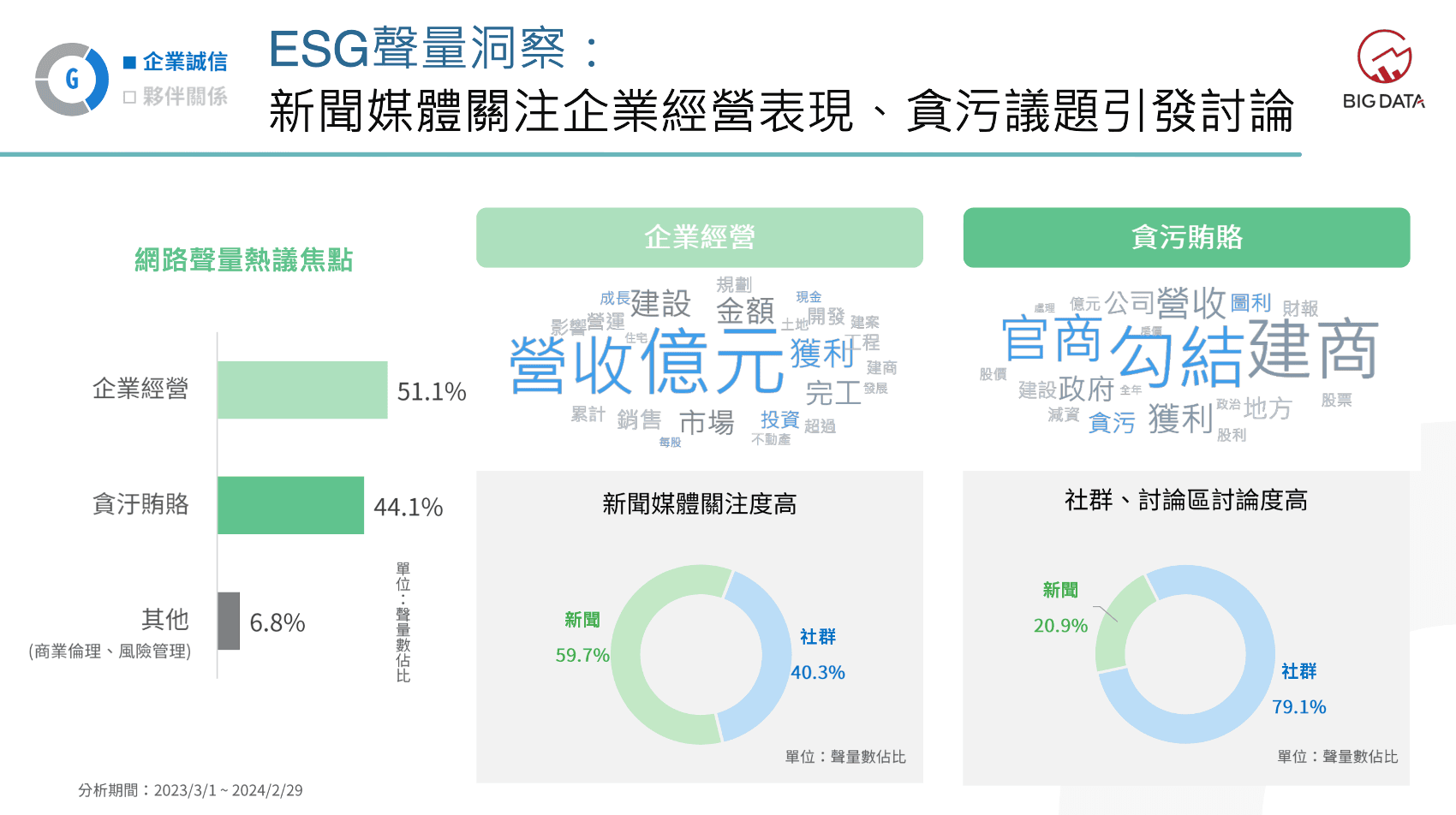永續報告書如同健檢報告,評鑑公司內外部整體表現,對內照顧員工與股東權益,對外展露的財務、營運資訊是否完整。公司誠信是一切根本,新聞媒體已近六成的聲量數關注在企業經營表現,貪污議題則會引發近八成的聲量數出現社群討論。在公司治理中,資訊透明有助強化企業信譽與社會信任度。建穩固的夥伴關係,更全面的滿足多元需求,更提升產業競爭力。營建業合作開發以都市更新的討論度最高,合建案可以降低單一開發的風險負擔,合作開發,優勢互補,提升市場競爭力。