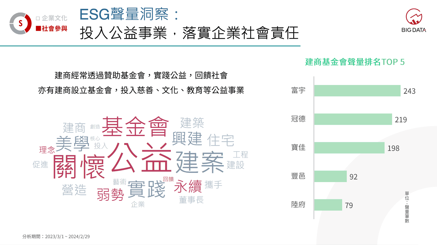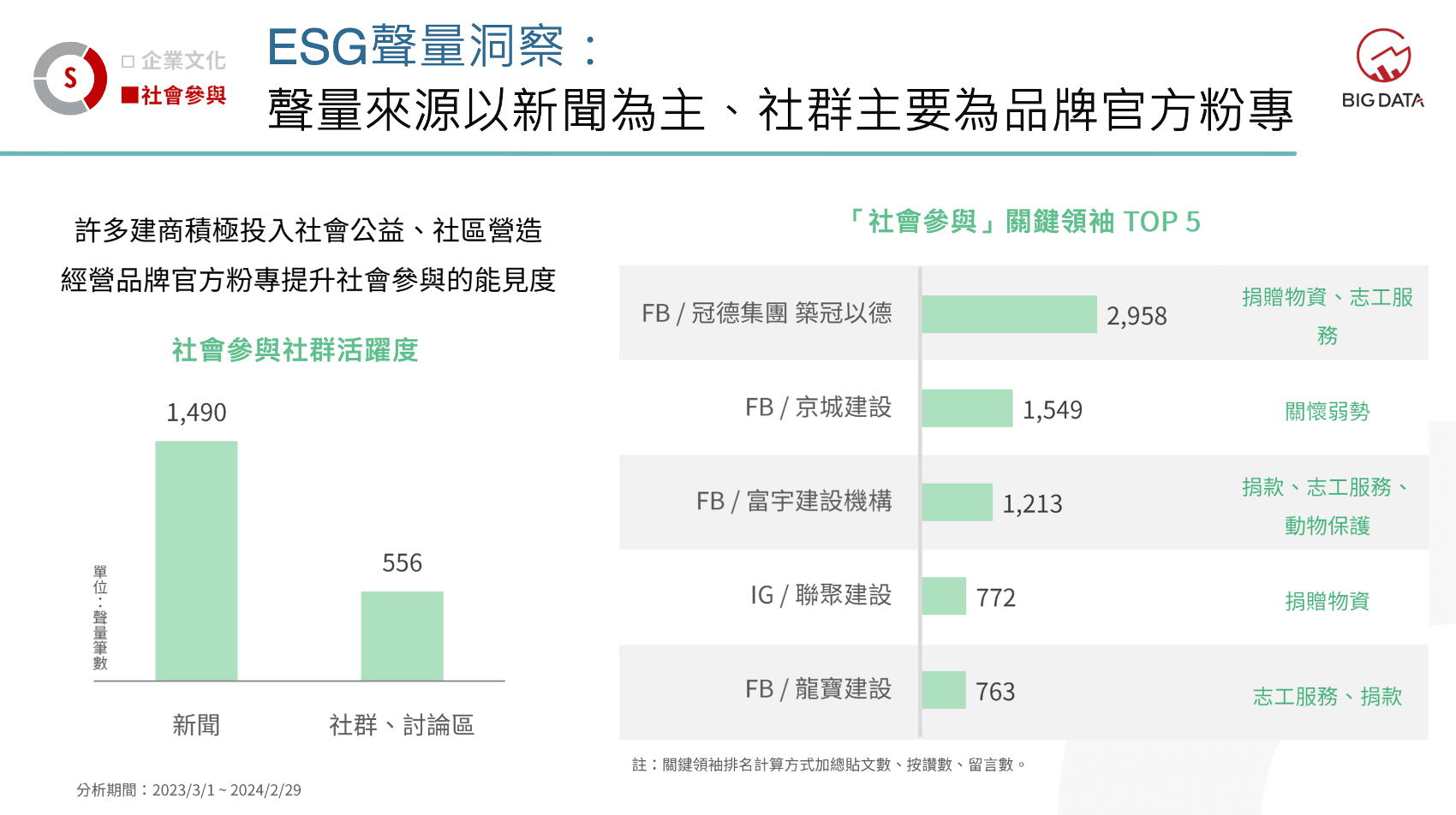 近年來企業社會責任廣泛受到討論,企業除了注重本身的營運狀況,也要考慮是否對社會和環境造成影響,「公益活動」也成為企業建立品牌形象及公關行銷的重要管道,營建業經常透過贊助基金會,實踐公益,回饋社會,亦有設立基金會,投入慈善、文化、教育等公益事業,結合品牌官方粉專曝光提升社會參與的能見度,但社群討論度仍不熱絡,遠低於新聞曝光近兩倍。