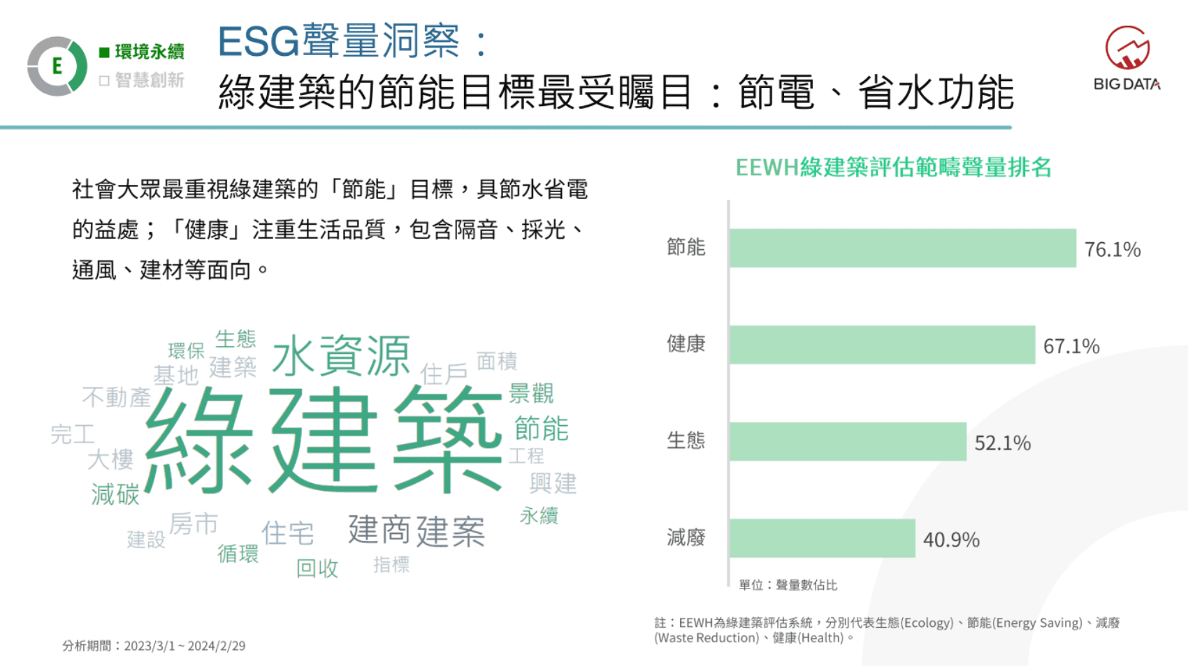 《深度解析營建業的永續革命 從ESG六大維度》產業洞察報告將參考MSCI、FTSE Russell等國際企業設定的ESG評級指標,並根據國內各建商發布的永續報告書,制定環境永續、智慧創新、企業文化、社會參與、企業誠信及夥伴關係等ESG六大聲量指標。為了達到2050淨零排放,各國政府制定準則,洞察報告指出,自2022年3月1日起至2024年2月29日止,環境保護聲量較去年同期上升18.3%,社會大眾最重視綠建築的「節能目標」,具節水省電的益處;其次是注重生活品質的「健康」面向,包含隔音、採光、通風、建材等。