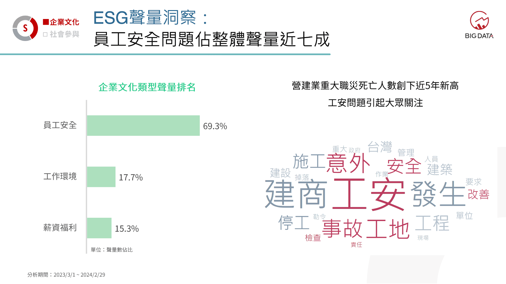 在營建業市場成長的背後,碳排放量受到關注,根據聯合國統計,建築物與營建業的碳排放量佔全球總量的37%,如何透過ESG達到永續經營,勢必是營建業須正視的議題。除了環境保護(Environmental),大數據股份有限公司日前發布最新《深度解析營建業的永續革命 從ESG六大維度》產業洞察報告,透過《KEYPO大數據關鍵引擎》輿情分析系統自2022年3月1日至2024年2月29日分析發現,過去一年營建業ESG六大維度聲量中,「社會責任」聲量較去年同期上升218.9%,遠高於環境保護、公司治理。進一步從社會責任面向分析,企業文化中「員工安全」問題佔整體聲量近七成,對此,大數據(股)公司營運長蔣志薇指出,根據2022年勞動檢查統計年報的統計,當年職災死亡中營建業占48.7%,是近5年最高,也反映在相關聲量上,員工安全、工安意外成為營建業在ESG指標上需要關注的重要議題。