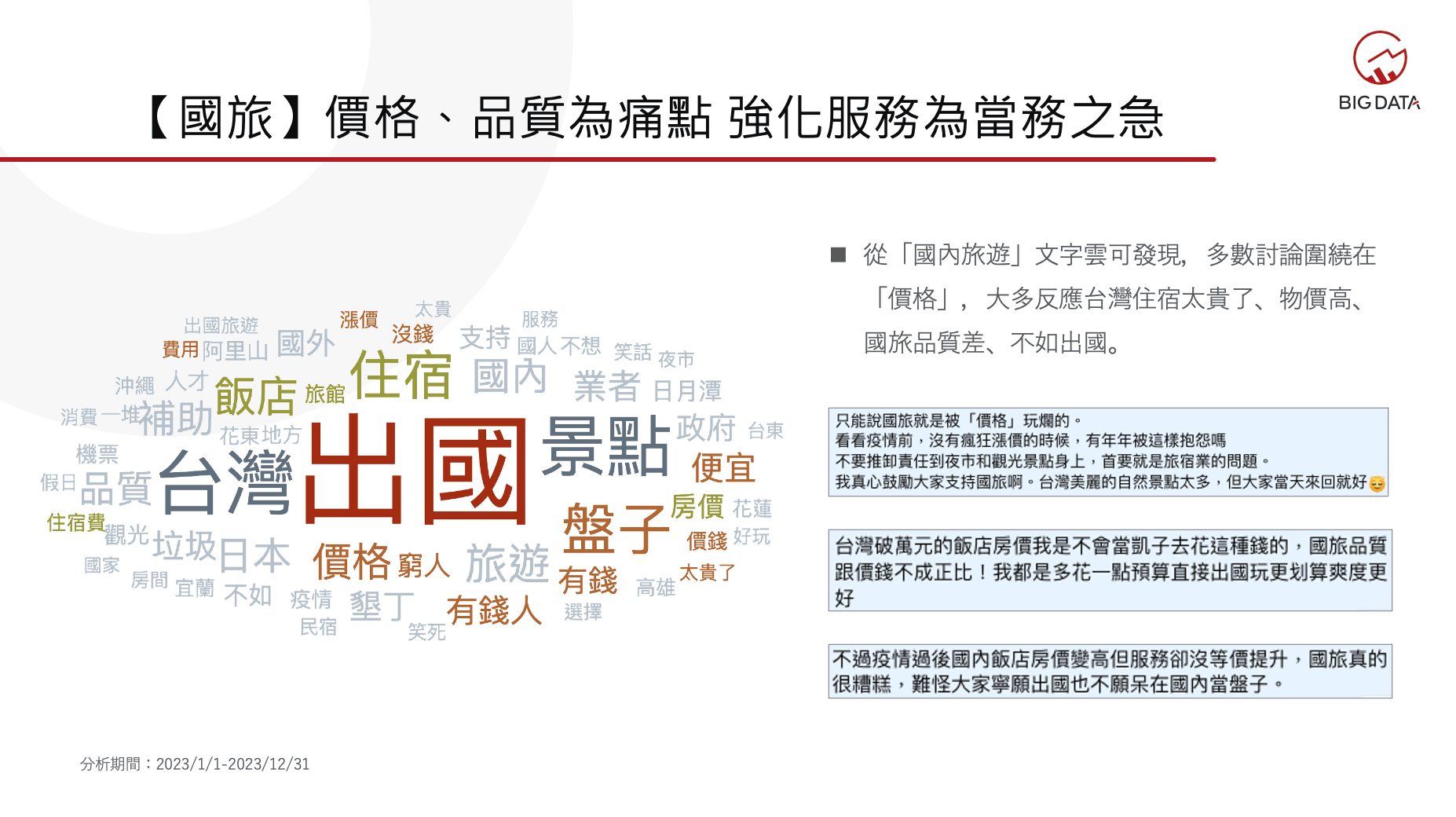 台灣民眾瘋出國,國旅住宿真的有受到影響嗎?根據中央社引述交通部觀光署最新統計,在旅館平均住用率方面,112年1到11月觀光旅館業為60.13%,較111年同期46.21%,增加13.92%,約成長30.13%;112年1到11月旅館業為47.99%,較111年同期41.17%,增加6.82%,約成長16.57%。明顯看出國旅住房狀況並沒有因出國旅客增加,而受到影響,民眾還是很願意在台灣旅遊。不過,就從《KEYPO大數據關鍵引擎》的「國內旅遊」文字雲可發現,多數討論圍繞在「價格」,大多反應台灣住宿太貴了、物價高、國旅品質差、不如出國。因此,價格、品質是國內旅遊的為痛點,強化服務是業者的當務之急。