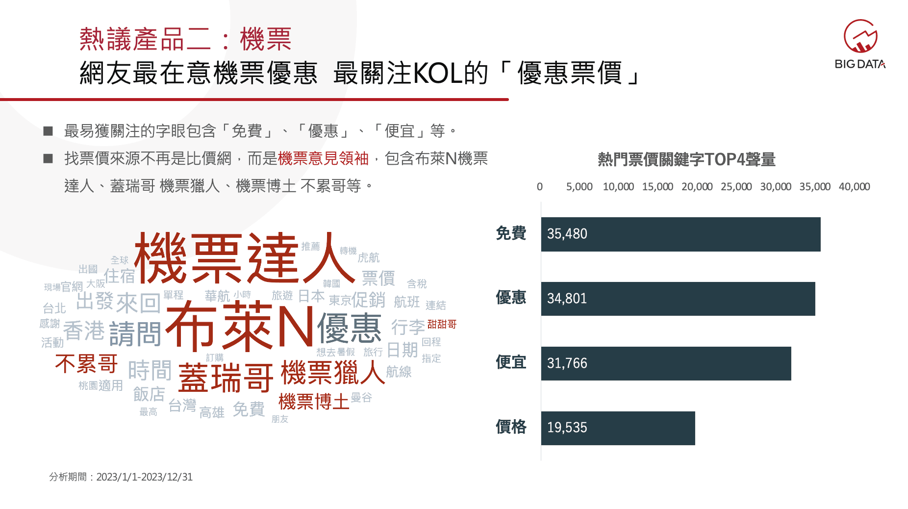 奪下2023年10大熱議商品的「機票」,其聲量較前一年成長2倍,高峰分別落在6月日圓創新低、7月香港政府送免費機票、9月虎航9週年全員促銷。網友在機票上特別在意「免費」、「優惠」、「便宜」等,尋找票價來源不再是比價網,而是布萊N機票達人、蓋瑞哥 機票獵人、機票博土不累哥等機票意見領袖。同時,消費者也會關注航空公司facebook粉絲專頁的「優惠行銷」,其中以長榮航空聲量最高,會在官方粉絲專頁上進行各類優惠宣傳獲高品牌曝光。而台灣本土最大航空公司則都以「永續航空」為行銷新亮點,長榮航空以「添加永續航空燃油」提升企業社會責任形象,中華航空運用「永續飛行挑戰」實踐「淨零碳飛行」。