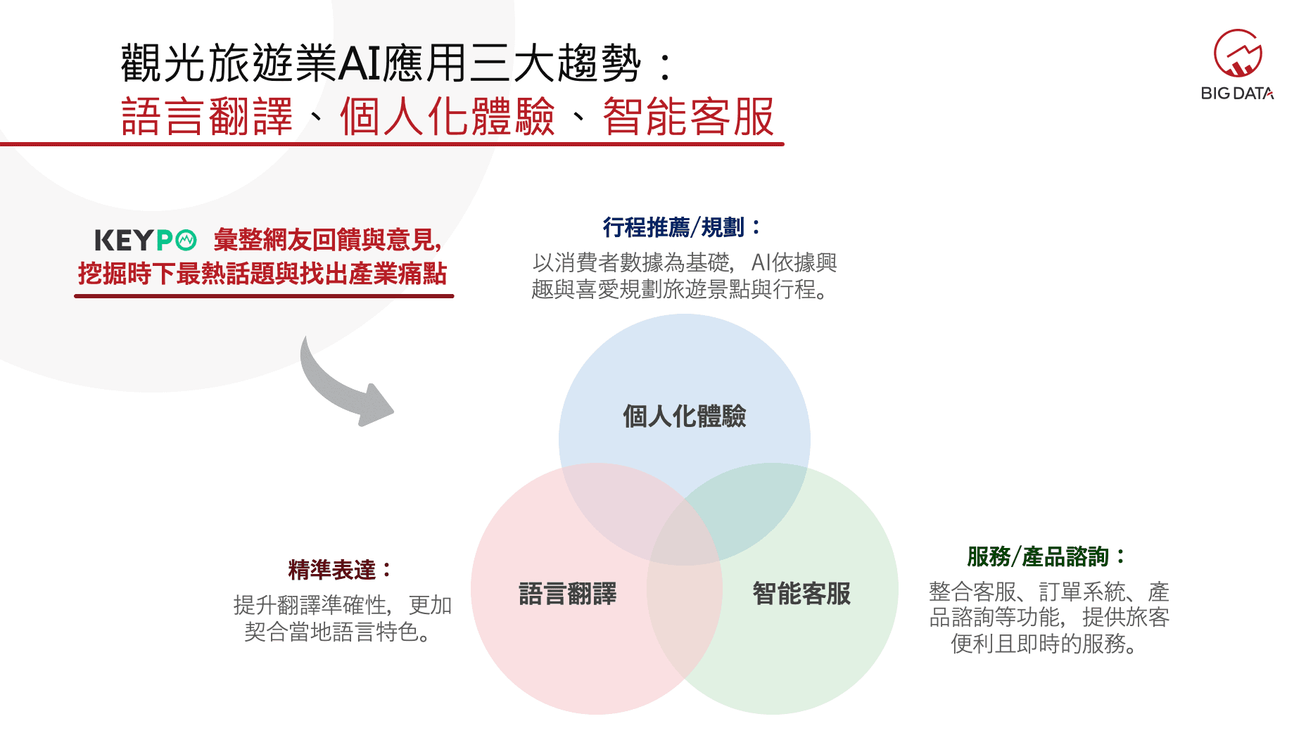 進入後疫情時代,全球觀光產業陸續復甦,在經歷過疫情後旅遊成本大增的過渡期,出國旅遊開始進入疫情前的榮景。但疫情期間火熱的國內旅遊,除了受到民眾出國旅遊的市場排擠影響外,房價過高也被消費者抱怨,盛況與過去差距甚大。大數據股份有限公司日前發布最新《如何運用AI賦能觀光產業》洞察報告,報告透過《KEYPO大數據關鍵引擎》輿情聲量分析2023年10大熱議產品,當中機票、行李箱佔據前兩名,旅平險也緊跟在後。隨著國旅成長放緩,有關國內旅遊多數討論圍繞在「價格」及「品質」,強化服務恐成當務之急。大數據(股)公司營運長蔣志薇指出,隨著國旅成長放緩,有關國內旅遊多數討論圍繞在「價格」及「品質」,強化服務恐成當務之急。在日新月異的AI時代,語言翻譯、個人化體驗、智能客服將成為觀光旅遊業AI應用三大趨勢。