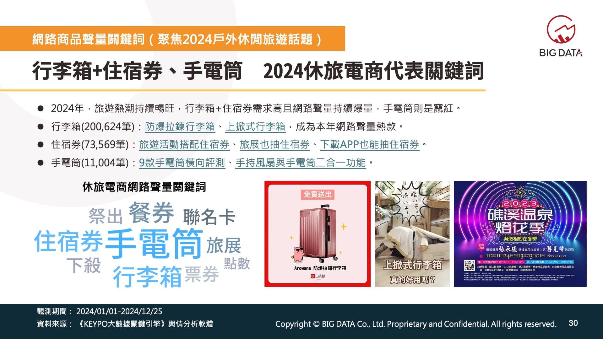 2024食品飲料生鮮三大聲量密碼:酸甜、內餡、醬汁,網路美食討論一但加入綿密內餡,酸甜滑順,軟嫩醬汁字眼,栩栩如生的文字自動刺激網友味蕾,聲量不由自主帶動上升。2024珠寶精品配飾聲量關鍵由珍珠帶動,全年將近23萬筆關於珍珠的討論,多數圍繞在經過設計的珍珠,搭配耳環、銀針等週邊配飾,氣質感吸引網友紛紛留言喊出「+1」。2024戶外休閒旅遊聲量透過行李箱點火,全年逾20萬筆聲量高度關注在更大的收納空間,更好拖曳的拉桿以及更好用的拉鍊,讓網友享受被行李箱裝載的旅遊好心情。