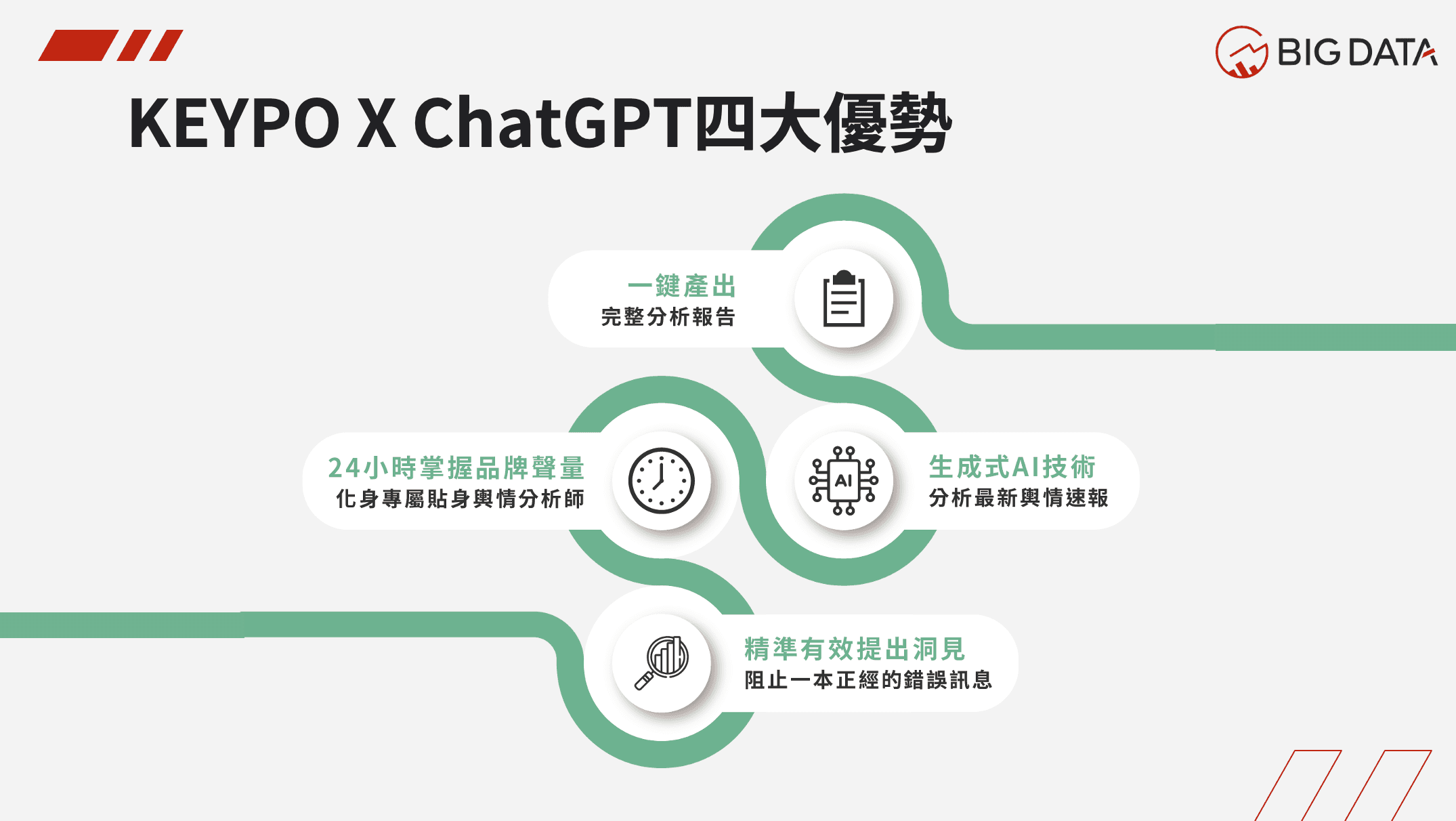 生成式AI 在提升社交聆聽能力方面發揮著關鍵作用,結合機器學習演算法能夠分析大型數據集,識別模式並根據客戶情緒和線上對話,不僅為企業提供了預測未來趨勢和消費者行為的能力,也能協助進行風險管理及危機處理建議。《KEYPO大數據關鍵引擎》最新「GPT智能輿情分析」功能運用先進的自然語言處理技術,並結合大數據股份有限公司即時網路輿情搜集的強大能力,實現真正的自動化輿情洞察報告生成功能。讓使用者得以迅速、準確地掌握網路輿情、市場趨勢及競爭對手動態,更能夠從中挖掘出深層次的原因和影響,協助企業品牌擬訂精準行銷策略,從而迅速抓住潛在消費者目光。