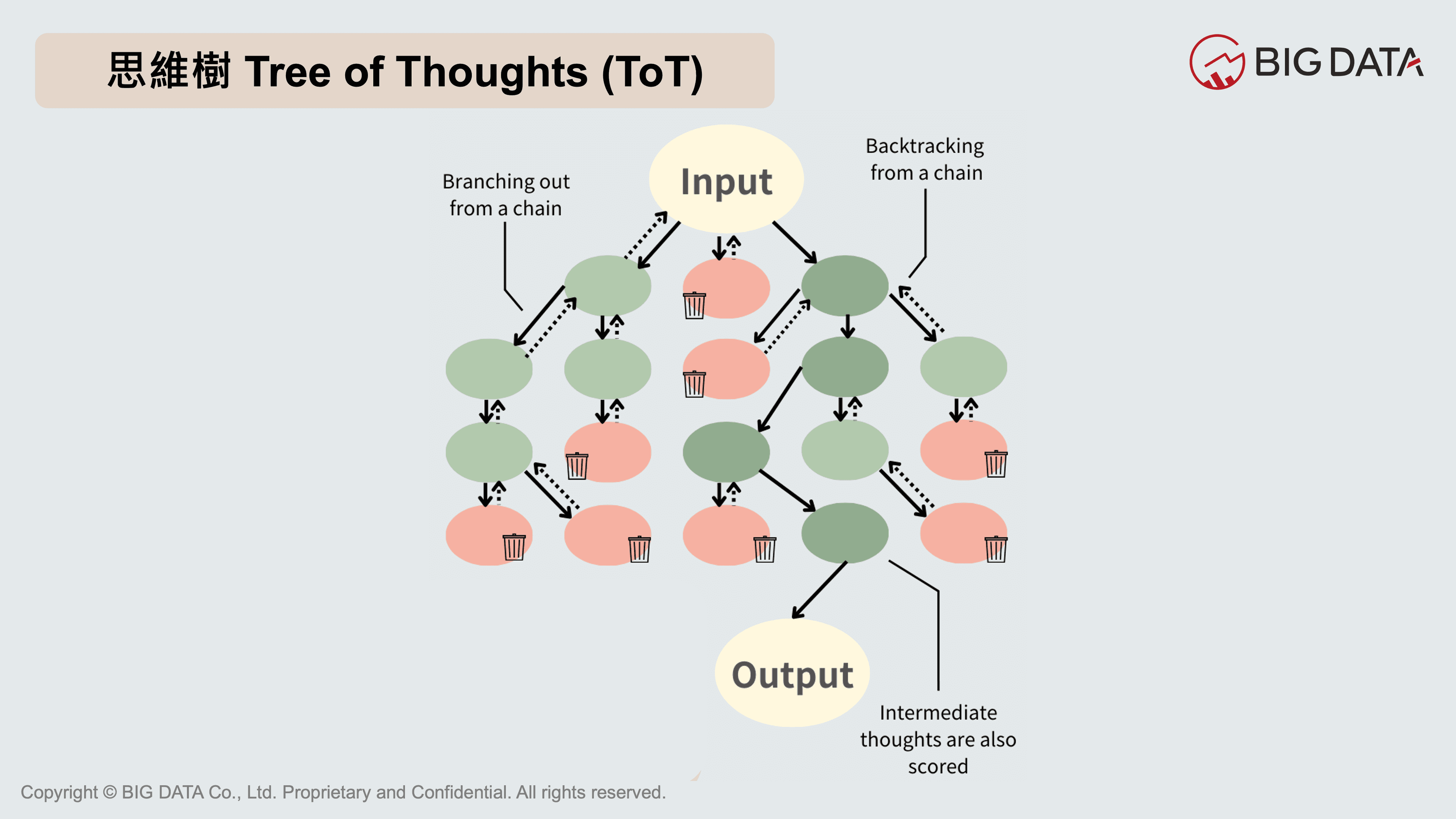 除了鏈狀結構,思維樹提供了另一種強大的推理模式。相比思維鏈,思維樹允許每個推理步驟往多個不同的路徑發展,從而產生更多潛在的解決方案。這種方式能更好地運用大型語言模型提示設計,讓模型在複雜問題下生成更豐富、準確的回應,有效提升模型的生成品質與實用性。無論是思維鏈還是思維樹,這些方法仍然遵循自上而下的推理模式。