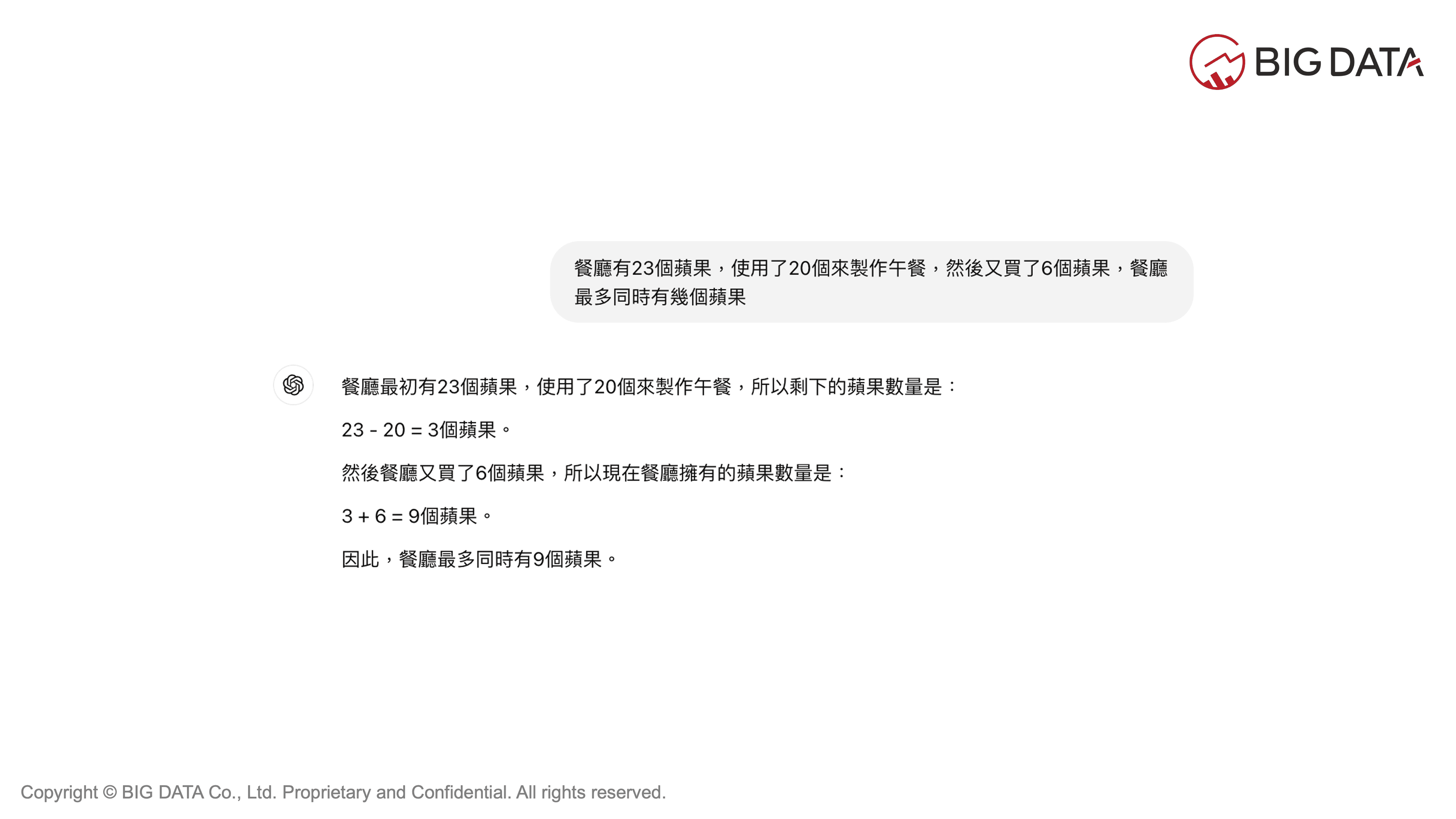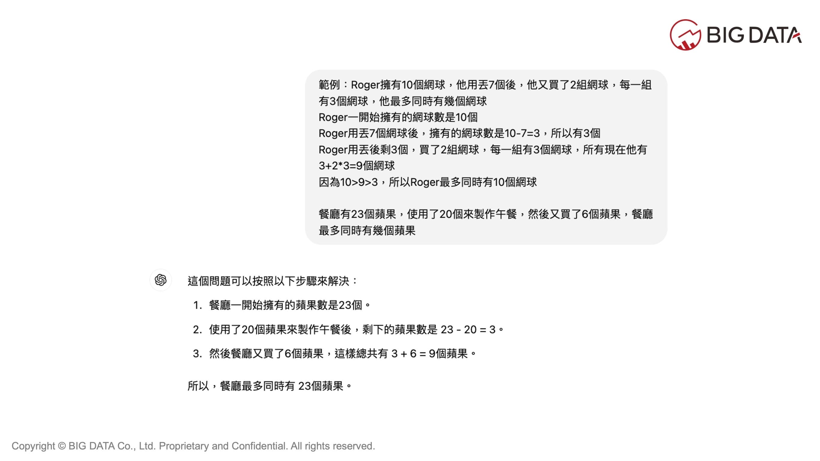 思維鏈提示是一種常用且有效的方法,重點在於引導模型一步步推理,將複雜問題拆解成小步驟,讓模型按照邏輯順序解決問題。當大型語言模型遇到「餐廳有23個蘋果,使用了20個來製作午餐,然後又買了6個蘋果,餐廳最多同時有幾個蘋果?」這樣的問題,回答可能不一定精準。因此,工程師會通過「Roger一開始擁有的網球數是10個。Roger用丟7個網球後,擁有的網球數是10-7=3,所以有3個。Roger用丟後剩3個,買了2組網球,每一組有3個網球,所有現在他有3+2*3=9個網球。因為10>9>3,所以Roger最多同時有10個網球。」的提示方式,加入合適的範例與推理步驟,使模型能效仿範例的解決方式,以提升生成內容的正確性,而這種單一且線性的思考模式,被視為一條思維鏈。