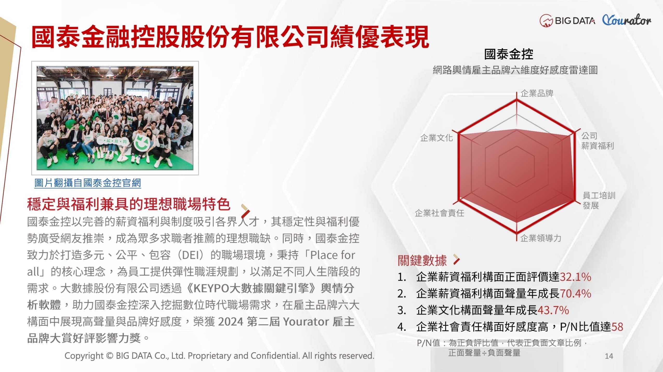 Yourator透過一年一度「雇主品牌大賞」表彰優秀企業,期望以標樣企業作為業界推動力,加速下一代數位人才的培育與發展。今年,首度邀請大數據(股)公司透過旗下《KEYPO大數據關鍵引擎》輿情分析軟體,分析2023年11月1日起至2024年10月31日的入圍企業在「企業品牌聲量」、「企業薪資福利」、「員工培訓發展」、「企業領導力」、「企業社會責任」、「企業文化」等六項指標上的表現。除了頒發雇主品牌大賞金獎及數位創新卓越獎,也新增「網路溫度計雇主好評影響力獎」。國泰金控以具有吸引力的薪資福利、全方位的員工職涯發展、網路推薦熱度高等卓越的表現拿下「網路溫度計雇主好評影響力獎」,成為網友心目中的最佳品牌。