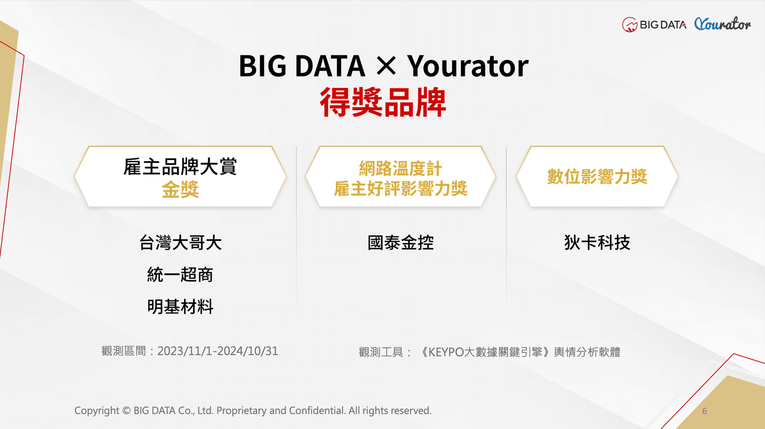 全球進入大缺工時代,企業為搶人才,都在改變招募方針,結合行銷策略、建立雇主品牌,期盼在競爭激烈的人才市場中脫穎而出。由Yourator數位人才媒合平台舉辦 2025數位職涯博覽會暨AI人才高峰會論壇,首度邀請大數據股份有限公司旗下《KEYPO大數據關鍵引擎》輿情分析軟體,以數據化、客觀的角度共同選出獲獎品牌,其中國泰金控獲得本屆「網路溫度計 雇主好評影響力獎」,並於今(14)日公布《第二屆Yourator雇主品牌大賞》洞察報告。大數據(股)公司營運長蔣志薇表示,從今年的獲獎企業中發現,企業除了在招募、聘用和留住年輕人才方面表現優異,並且在發展企業文化、創建員工培訓發展和員工福利方面表現亮眼。2025 年是公司成立十週年,期待透過首次參加職涯博覽會,號召更多具有數據科技實力與創新技術人才加入團隊,為IPO公開發行作業蓄積能量,共同前進。