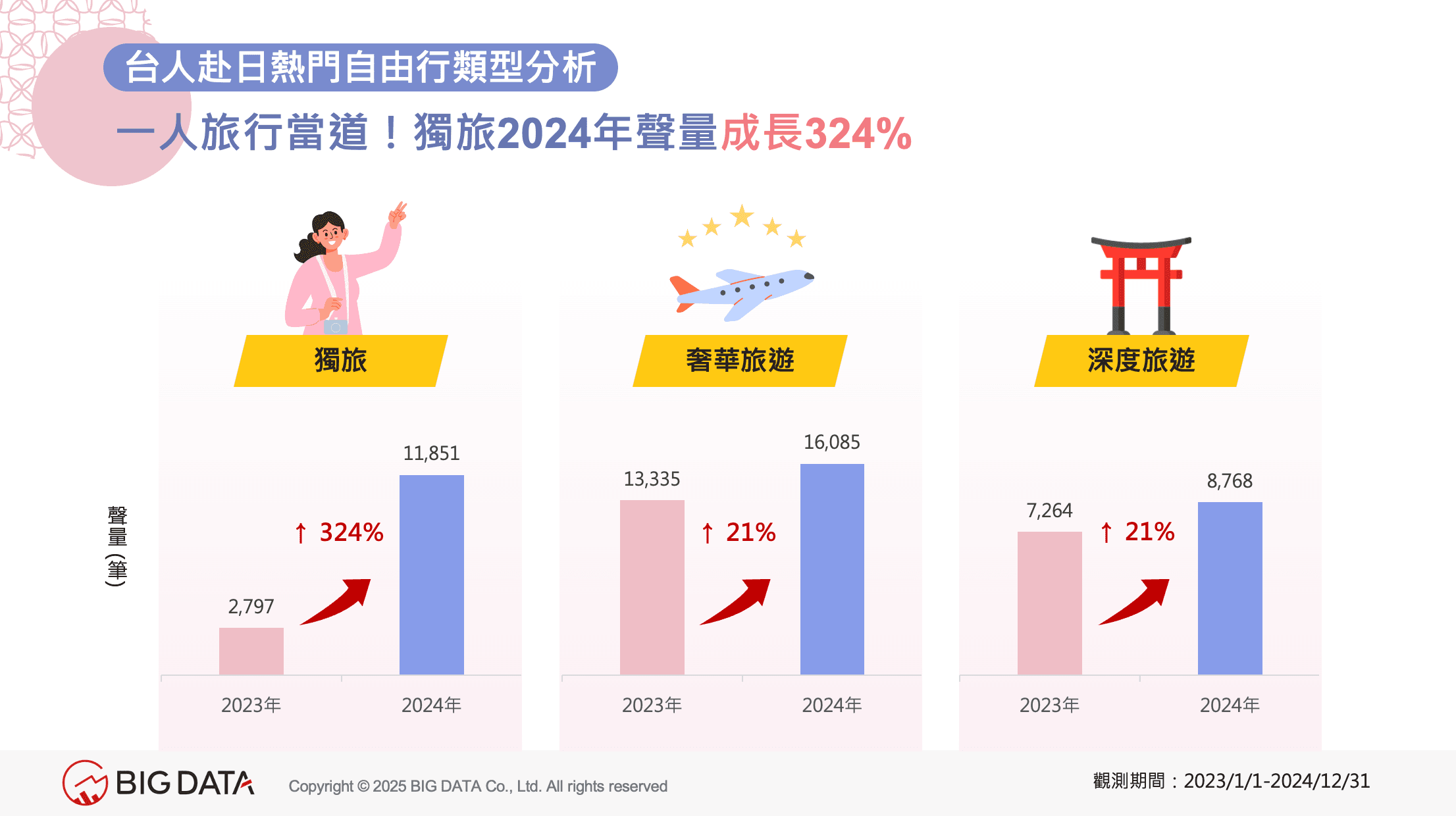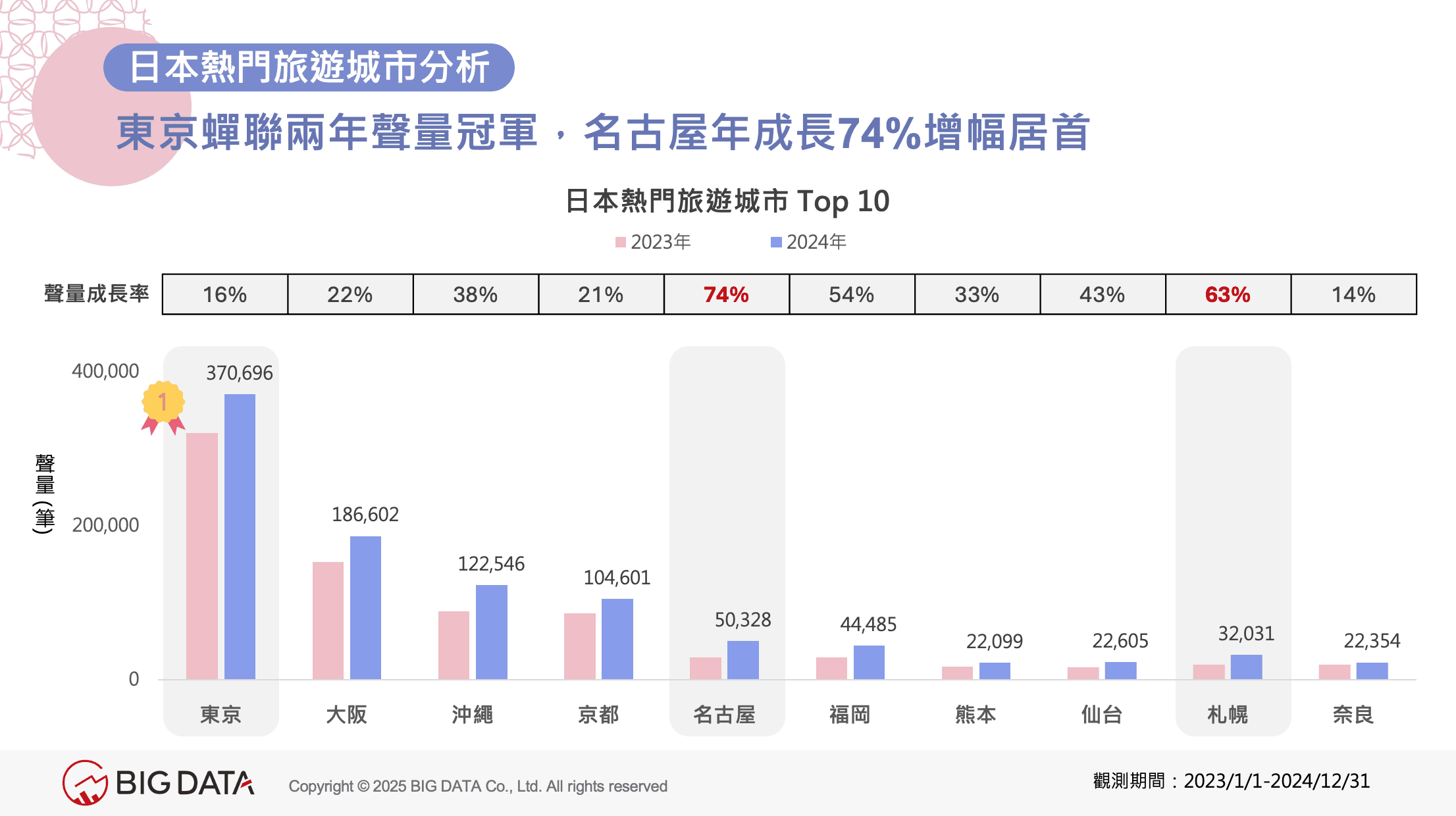 台灣人究竟有多愛前往日本旅遊?自由行、奢華團、獨旅風潮正盛,旅行社還有機會嗎?誰是今年爆紅的旅行社黑馬?大數據股份有限公司於今(26)日公布最新《2025最新旅行社撩動台灣人遊日心法》洞察報告,透過《KEYPO大數據關鍵引擎》輿情分析軟體自2023年1月1日至2025年3月31日統計發現,2024年總聲量近200萬筆,年成長率達17%。同時,日本熱門旅遊城市中,東京蟬聯兩年聲量冠軍,名古屋年成長74%,增幅居首。大數據(股)公司表示,日本旅遊不只是「出國放鬆」的選項,自由行、獨旅與文化體驗將成為新主流,除了價格,旅客更追求內容的深度與情感的共鳴,這也代表旅行社未來的角色,將從「行程規劃者」轉型為「生活體驗策展人」。