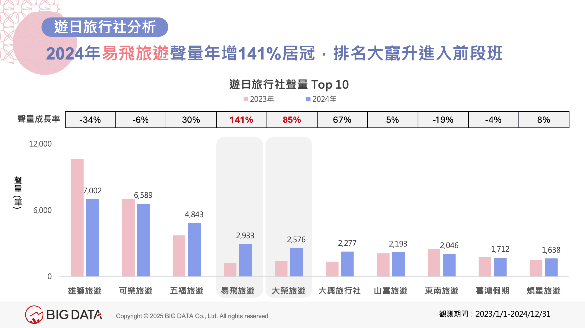 2024年,台灣旅行社仍積極佈局赴日市場,透過創新行銷與產品設計再創聲量佳績。雖然部分旅行社2024年日本旅遊市場聲量都較2023年衰退,但易飛旅遊、大榮旅遊、大興旅行社、五福旅遊、燦星旅遊及山富旅遊等都較去年成長。其中,易飛旅遊以「日本旅遊專家」自我定位強勢突圍,年聲量一舉成長141%。主打東京近郊的全方位玩法,結合親子樂園、自然美景、購物與溫泉,推出符合小資與家庭族群需求的半自助主題行程,輕鬆實現夢幻又多元的東京之旅。同時,易飛旅遊也積極耕耘沖繩市場,結合風獅爺文化與自由探索行程,打造具深度與情感連結的沉浸式在地體驗。