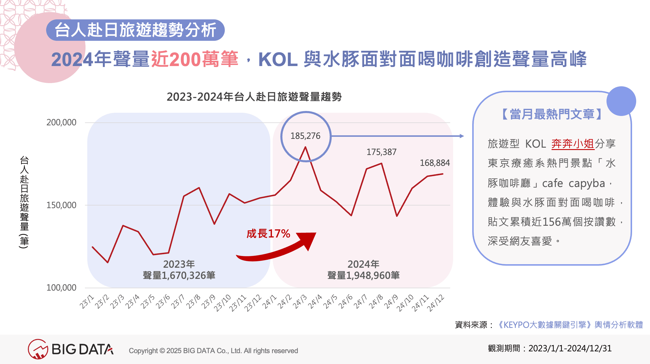 根據交通部觀光署統計,2024年台灣出境人次達1,685萬,其中前往日本的旅客高達600萬人,顯示日本依然穩居台灣民眾最愛的海外旅遊目的地。同時,大數據(股)公司最新《2025最新旅行社撩動台灣人遊日心法》洞察報告也指出,透過《KEYPO大數據關鍵引擎》輿情分析軟體,自2023年1月1日至2025年3月31日間觀測,針對2024年日本旅遊的網路聲量高達194.9萬筆,較2023年成長約17%。這不僅反映實際人流大幅上升,也同步帶動KOL貼文、社群互動與網路討論熱度,形成線上線下旅遊熱潮共振。