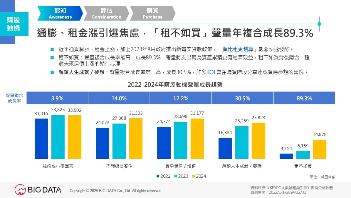 2024年房市正式進入「供給大於需求」新階段,新成屋供給突破6萬戶,交易量卻跌破4萬筆,加上第七波信用管制政策壓抑需求,使建設公司面臨更激烈的去化挑戰。根據大數據(股)公司發布《買房市場變冷,購屋聲量變熱:建設公司應該知道的三大新思維》報告,透過《KEYPO大數據關鍵引擎》輿情分析軟體分析2022年1月1日至2025年5月31日的網路聲量變化,近三年通膨與租金高漲,特別是2023年政府推出新青安貸款政策後,催化「租不如買」聲量快速累積,年複合成長率高達89.3%,成為2023及2024年房屋市場重要旋律。也讓「買房是否等於成家立業」成為社群熱議的價值議題,影片開箱、KOL討論熱潮不斷,帶動建案與品牌曝光新契機。但2025年房市買氣轉冷,單一訴求已無法打動消費者,購屋者更關心的是CP值。